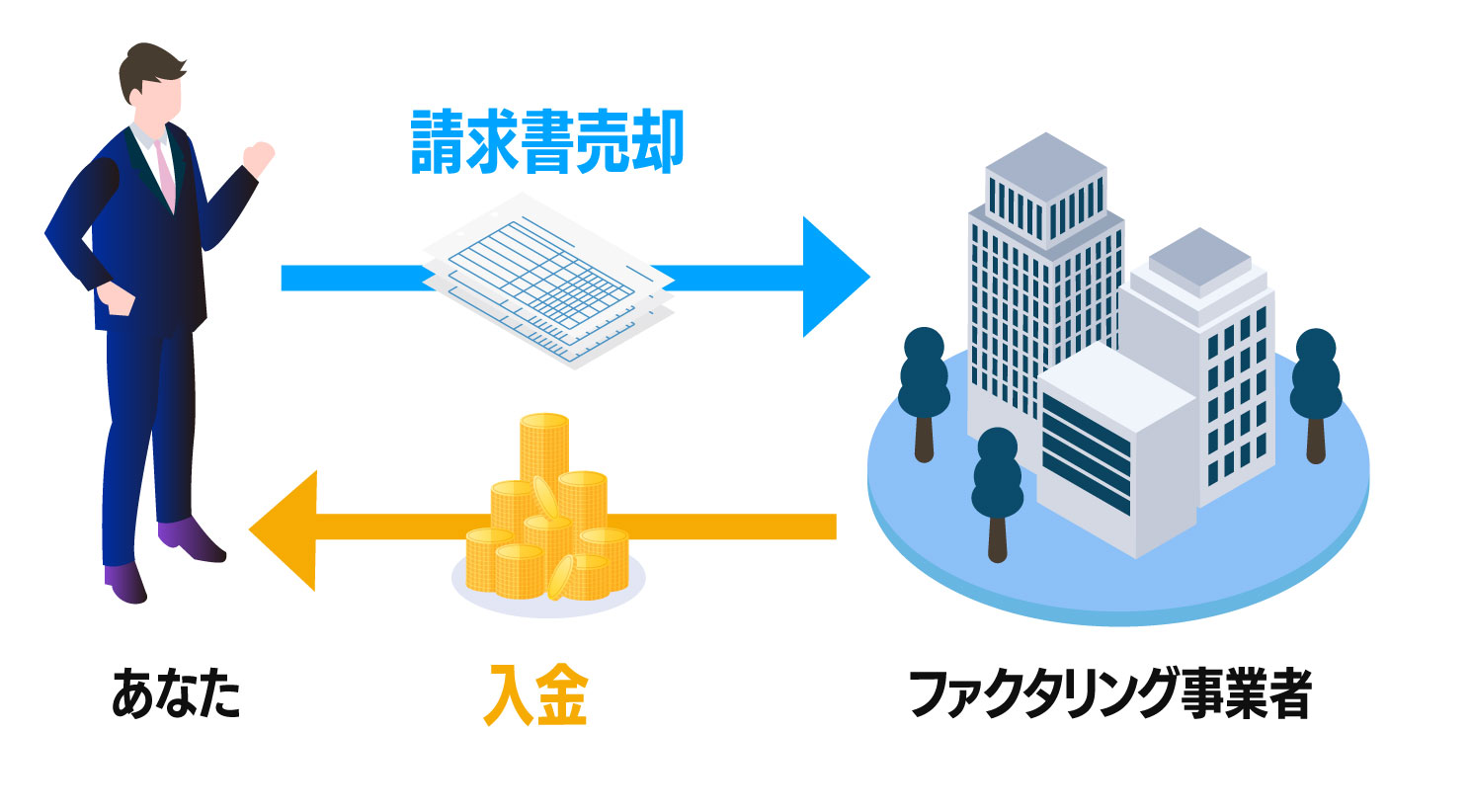 法人様や個人事業主様の請求書(売掛債権)をファクタリング事業者が買い取ることで、期日よりも早く現金を手にすることができる資金調達方法のことです。