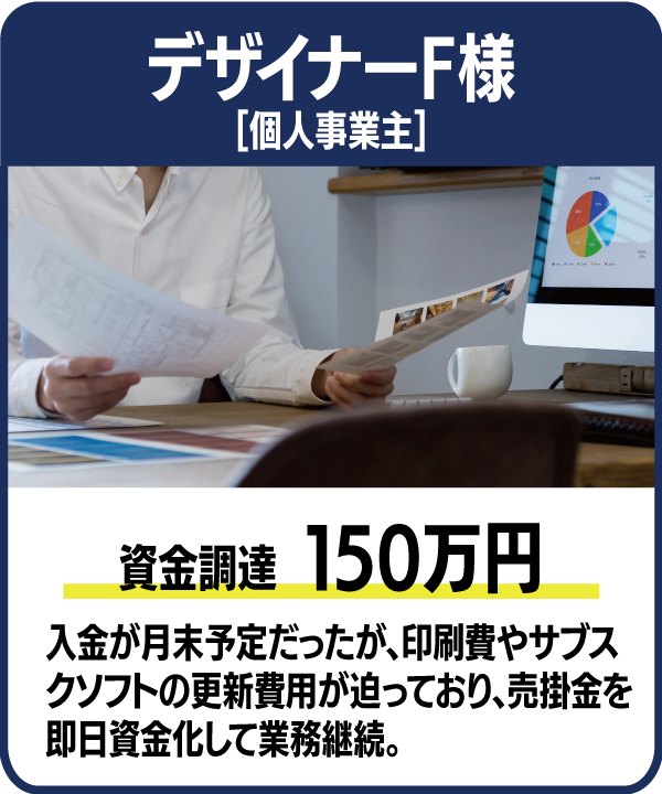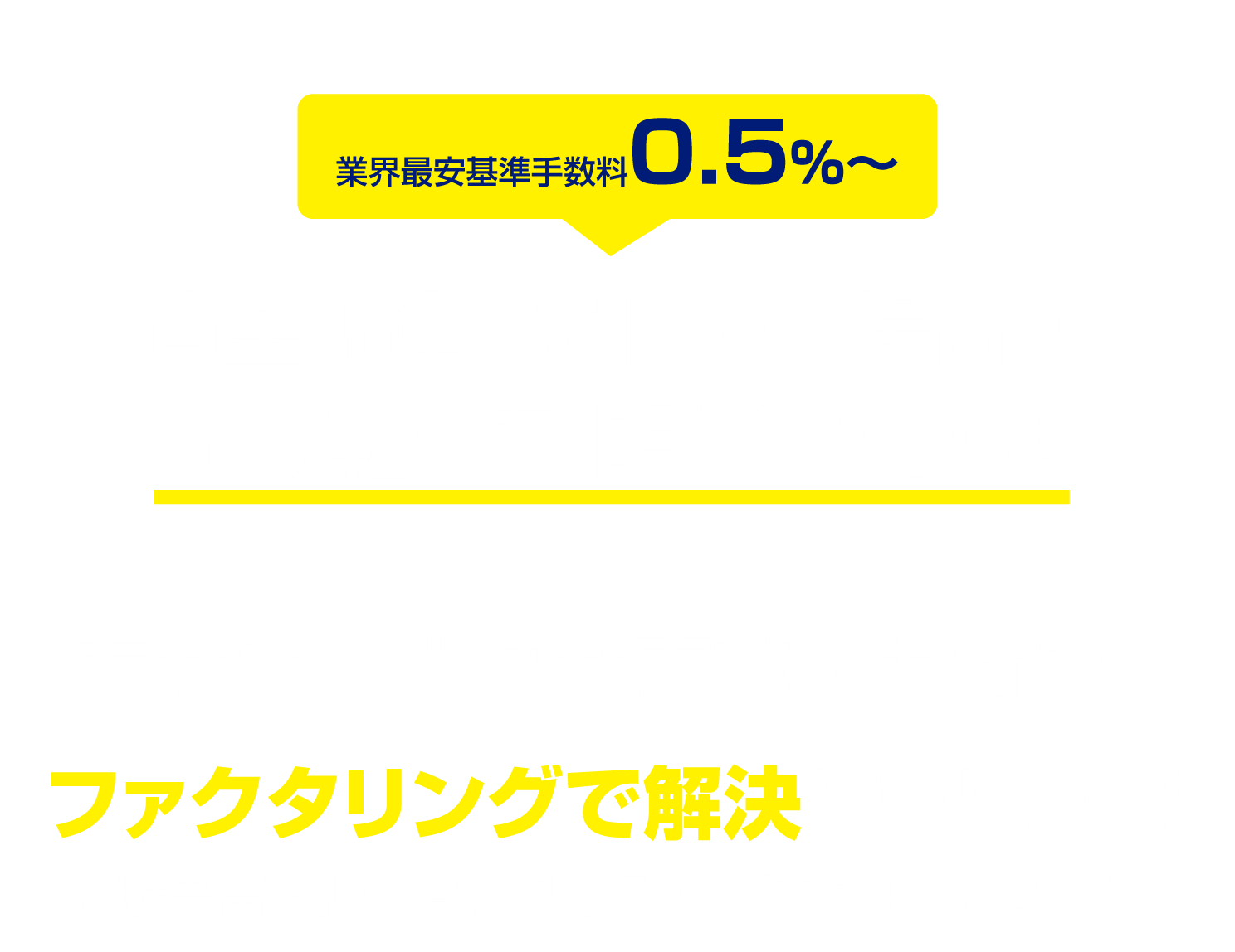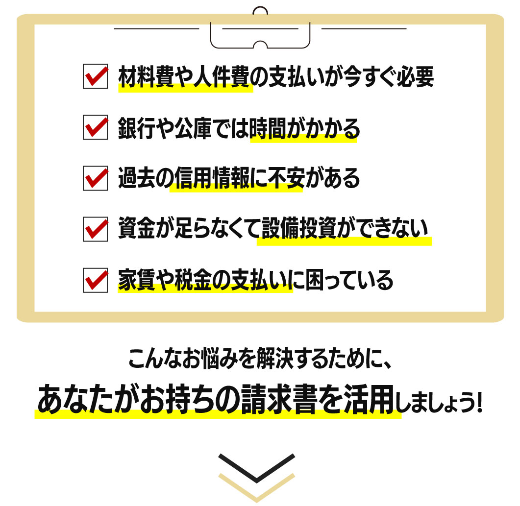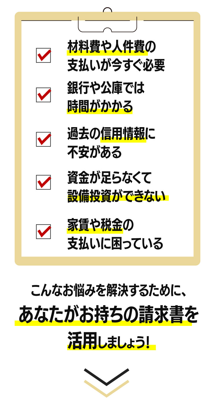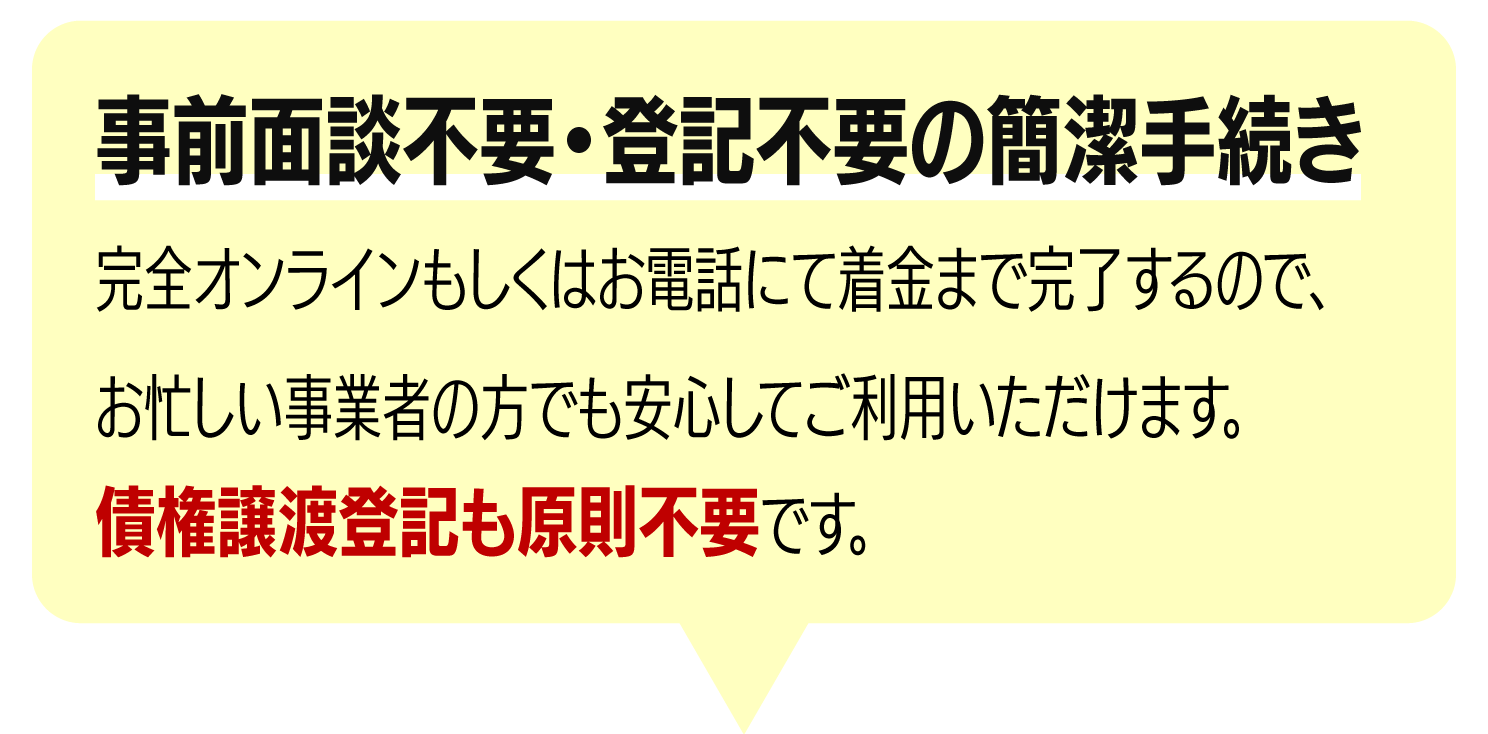 ※消費者金融業者ではありません。※法人さま・個人事業主さま向けの売掛金買取サービスです。融資ではありません。※会社従業員の方向けの給料ファクタリングは行っておりません。