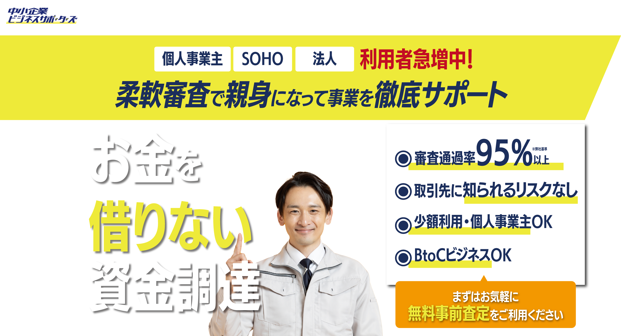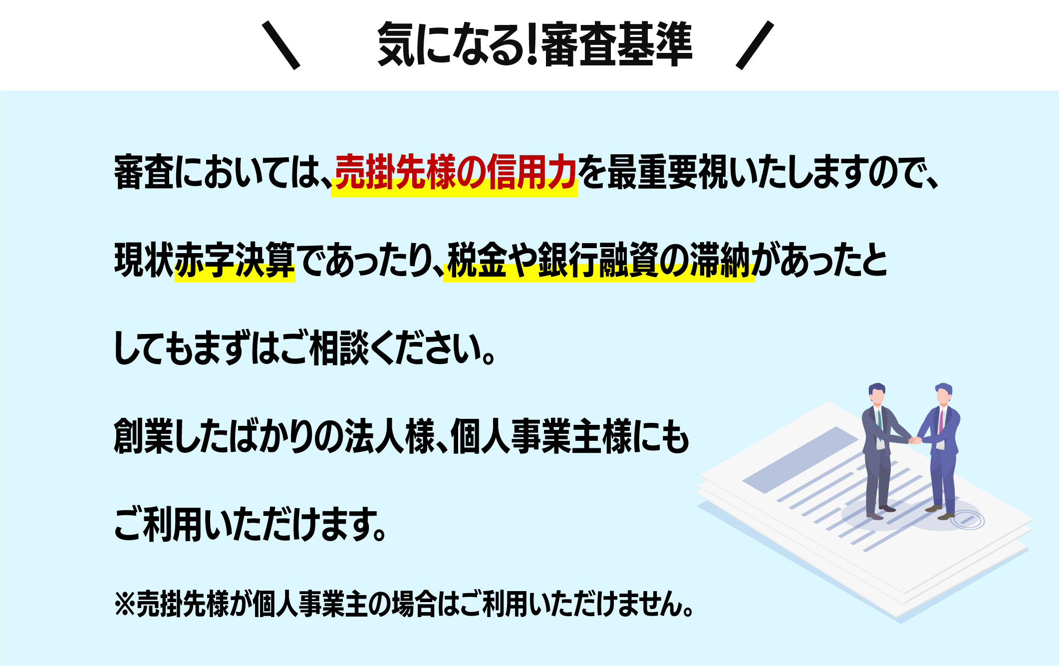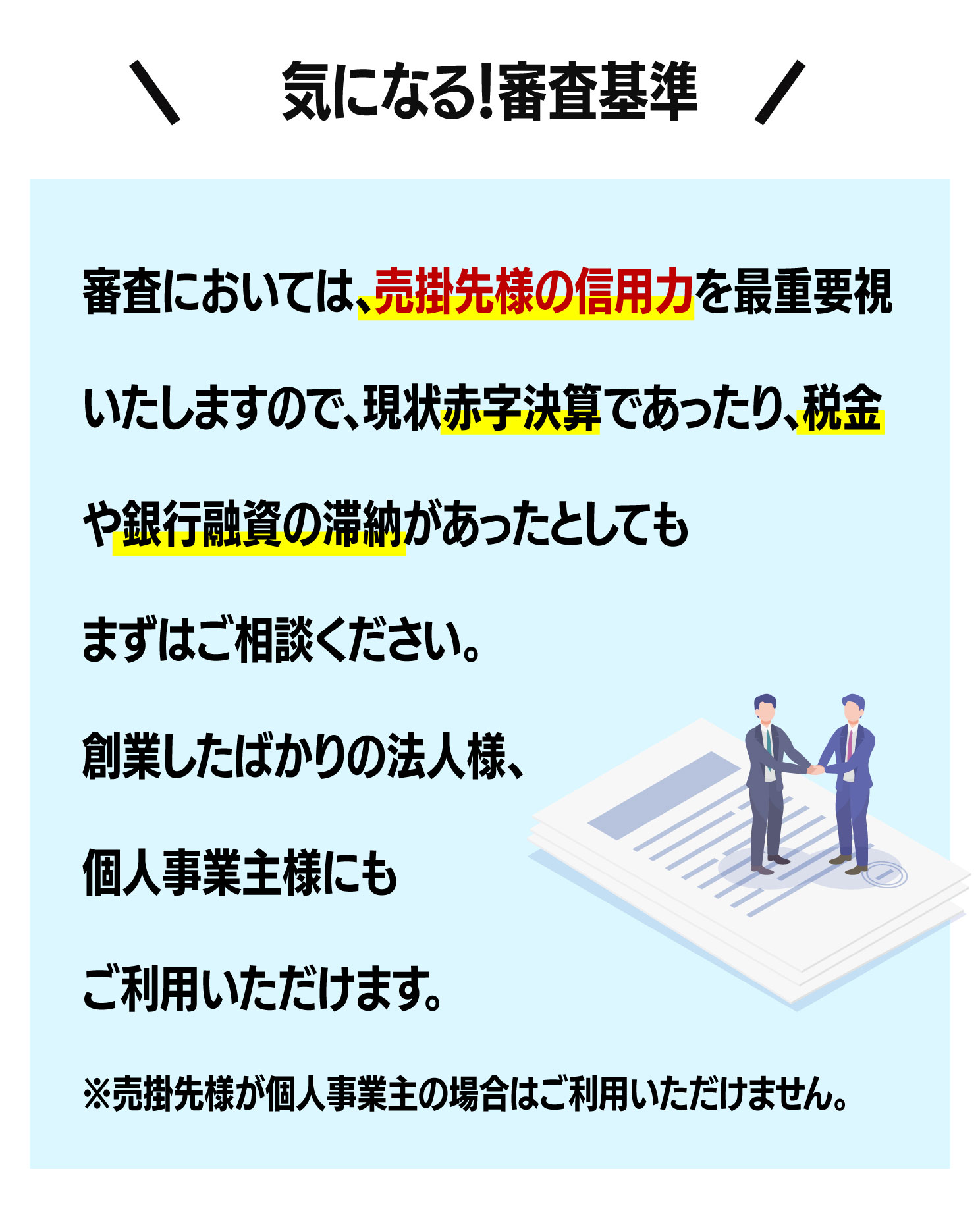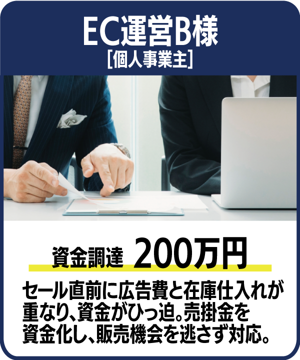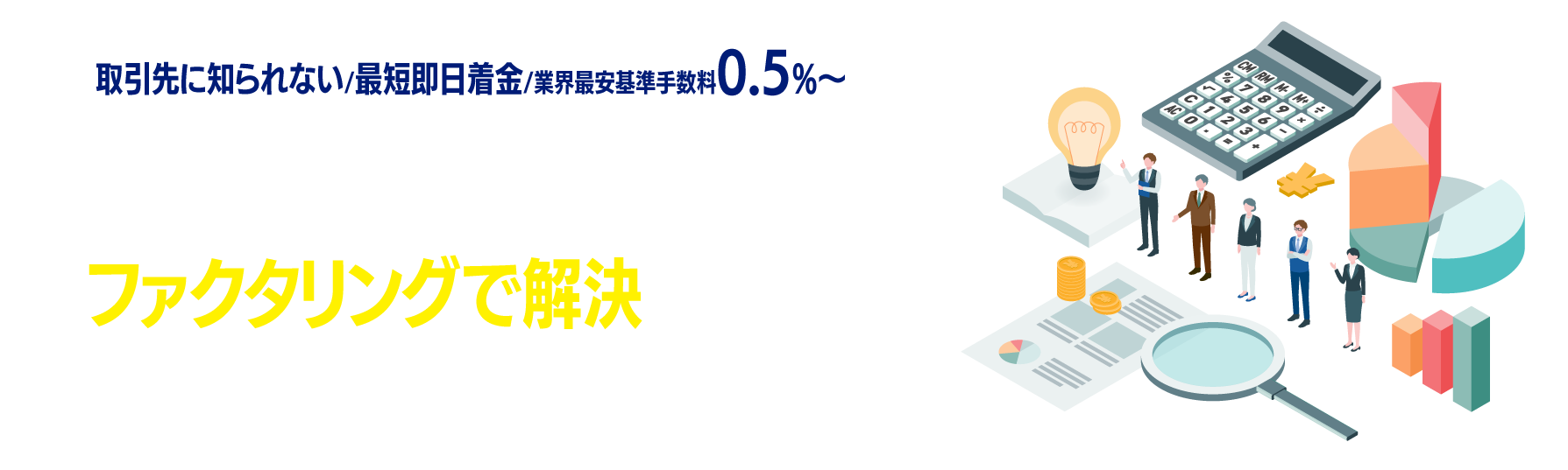 ※消費者金融業者ではありません。※法人さま・個人事業主さま向けの売掛金買取サービスです。融資ではありません。※会社従業員の方向けの給料ファクタリングは行っておりません。