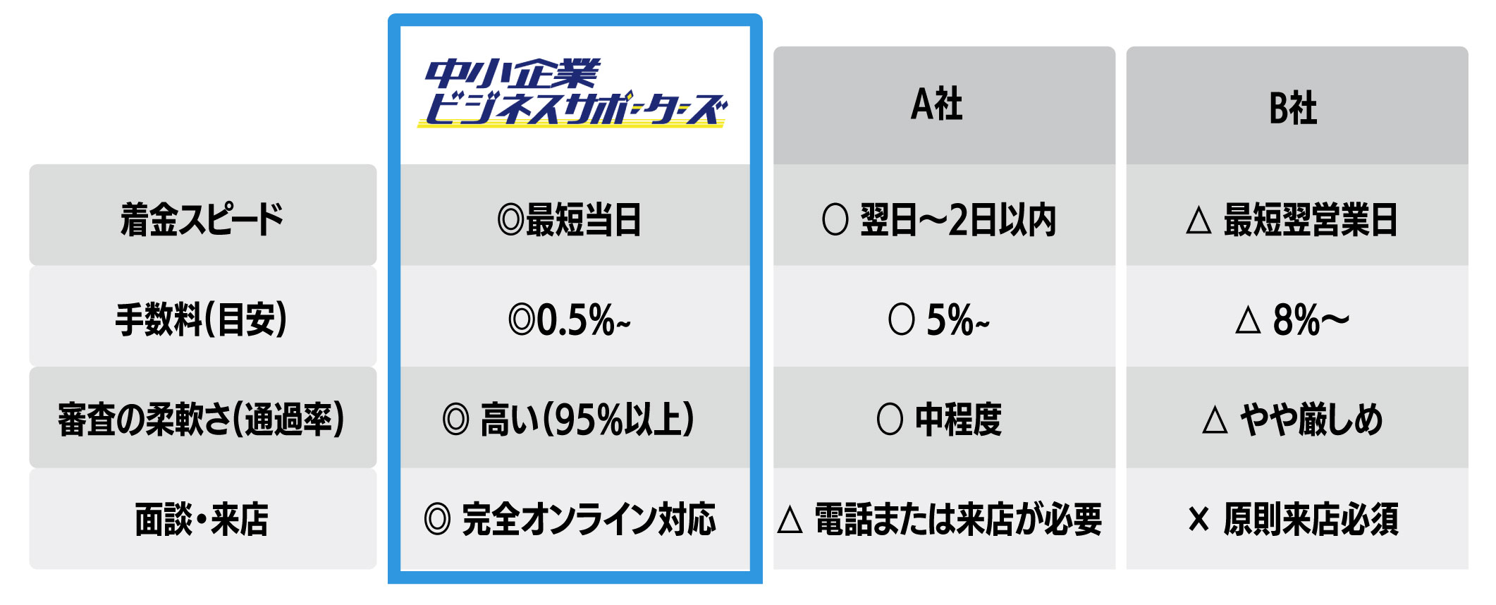 | 資金調達スピード | ◎ 最短即日 | △ 数日〜数週間 | ○ 最短即日 |