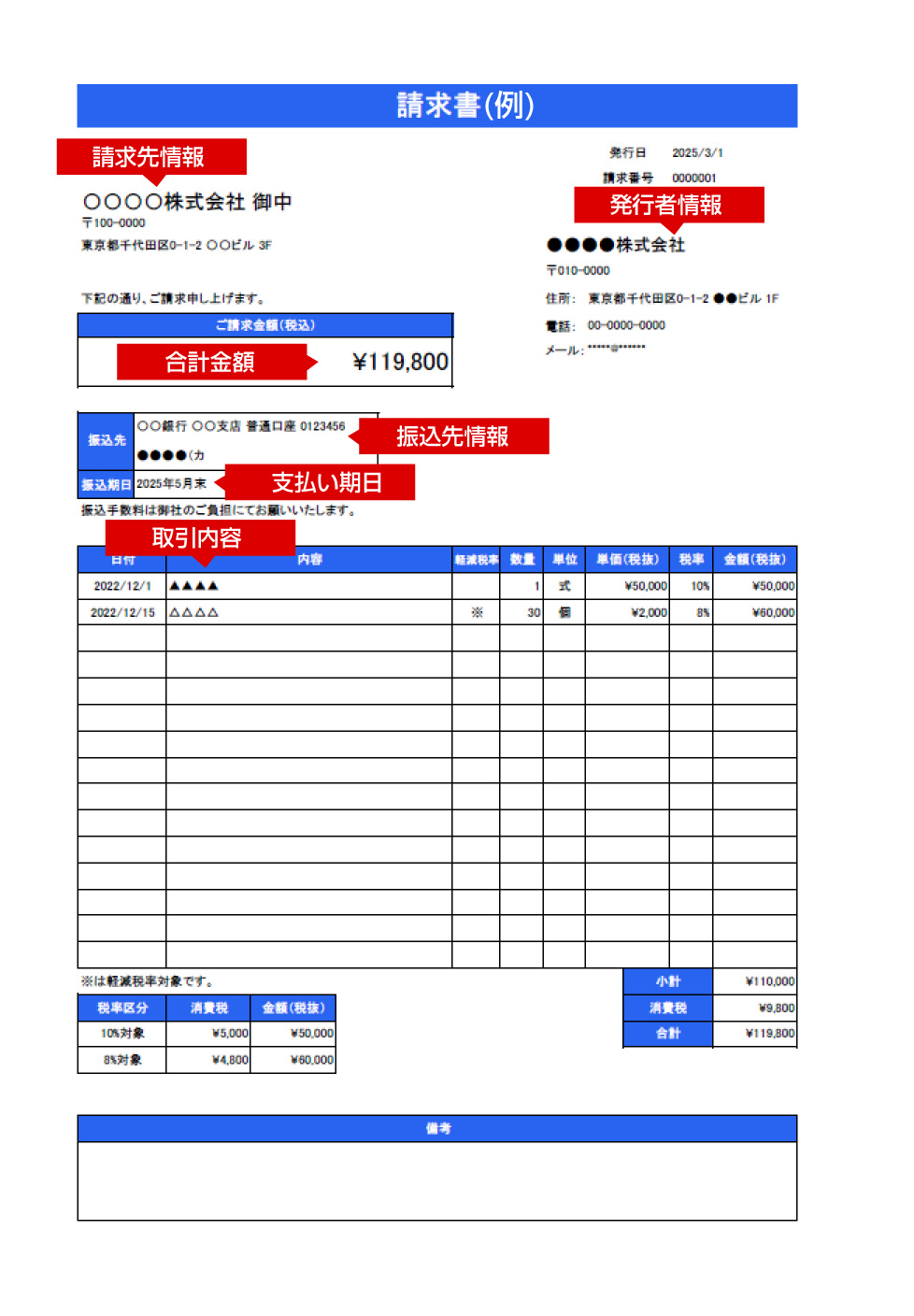 請求先情報・発行者情報・発行日・支払期日・取引内容・合計金額・振込先情報